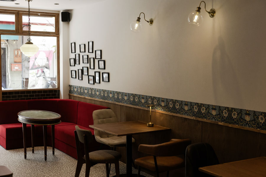 ソファ、床、壁、カウンター、照明、カップはレトロに。
